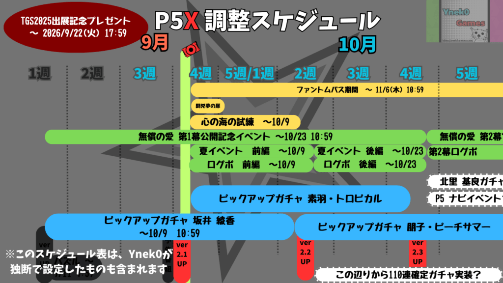 一応ロードマップには10月上旬となっていたのでいつも通りのスケジュールに戻るのであれば9日にアップデートが入るかなと思われます。